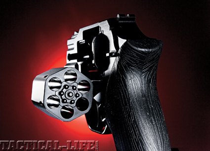The Rhino will eventually be offered in a number of barrel lengths, but the 2-inch snubbie is the first model to hit American shores. This makes a great deal of sense to me, as it is the snub that still enjoys huge popularity with those who are concerned with their personal security. The Rhino is a true milestone in the long history of the revolver. As with all new concepts, the Rhino has its own unique features like a flat-sided cylinder that makes the gun more concealable and more comfortable to wear, but it is the barrel location that makes it unique. The Rhino barrel is aligned with the bottom cylinder chamber, which is the key factor to the Rhino’s ability to tame the stout recoil of the .357 Mag cartridge—even from the short 2-inch barrel. The position of the barrel lowers the bore centerline more in line with the shooter’s arm allowing for a more natural point when engaging a target. For example, the height of the bore over the forearm of the world’s most popular revolver, the Smith & Wesson Model 10, is 2 inches. The height of the bore over the forearm for the Rhino is a mere 0.75 of an inch—a significant difference.