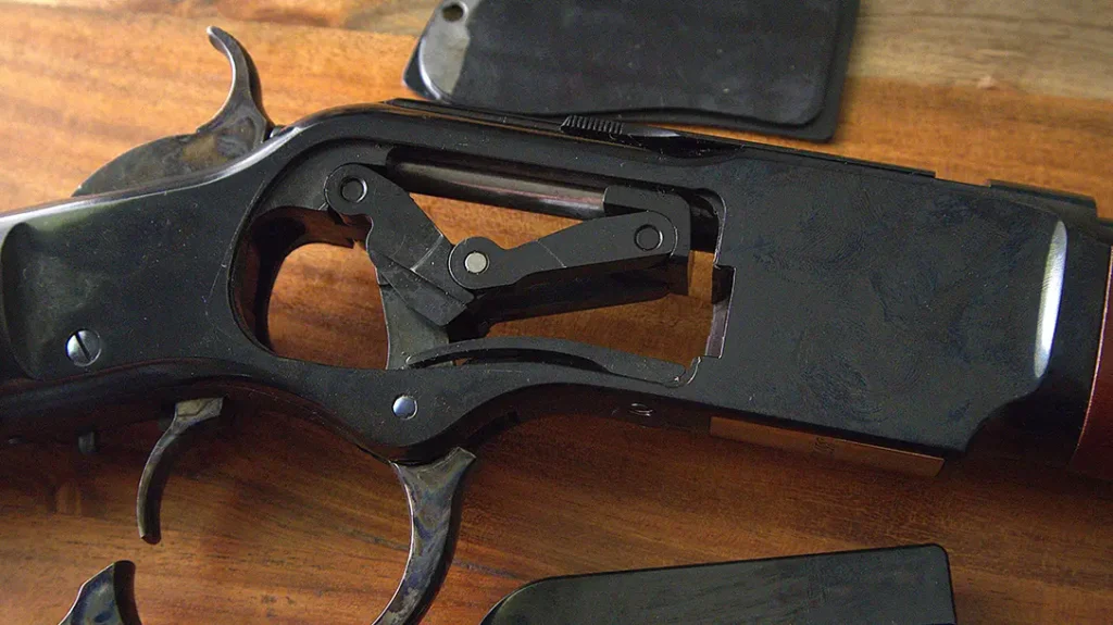 Uberti makes a beautiful 1873 replica that can easily be set up for cowboy action shooting, hunting, and even personal protection. Cimarron’s take is slightly improved internally over a stock Uberti. When I first took delivery of the Cimarron US Marshal Indian Territory Carbine, I went about disassembling and cleaning for an initial lube job. The 1873 has a through-screw that holds a pair of side plates together on the receiver. It was easy to remove, and the side plates themselves have a few distinctive mill marks.