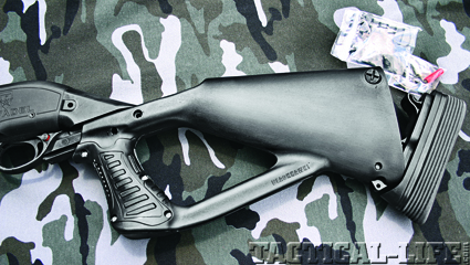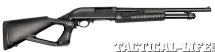 This model of the Citadel LE shotgun features the BlackHawk Talon stock — a skeletonized design with a pistol grip and recoil pad that also serves as a cover plate for a compartment in the stock.