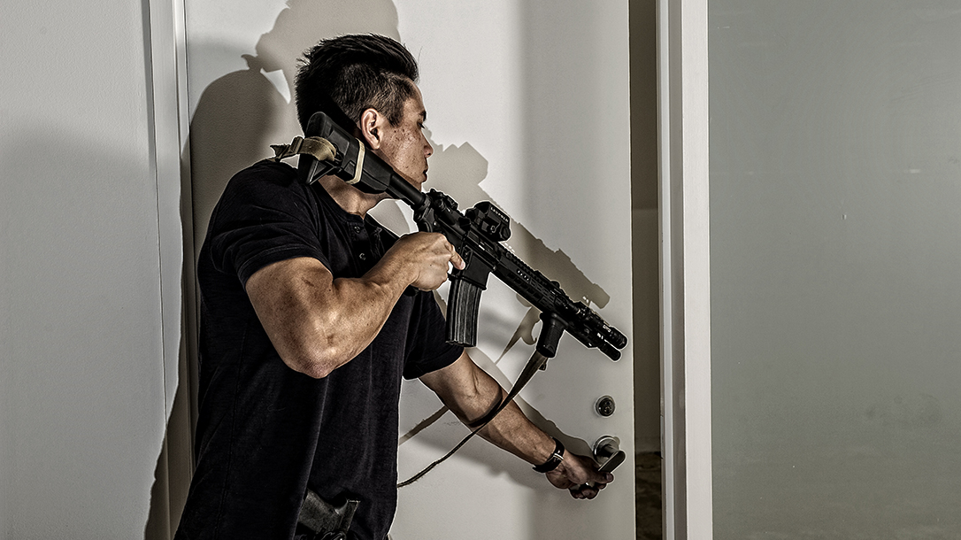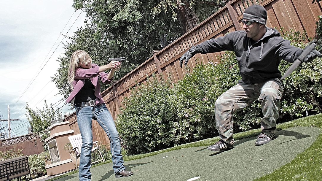 As she moves into a protective position between the stairwell and the children’s rooms, she points the weapon and thinks, “Can I shoot? Should I shoot? If I do shoot, when and what will the police think?”