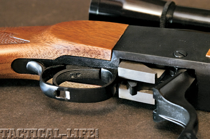 The two “adjustment” screws in the face of the today’s Ruger No. 1s supposedly adjust weight of pull and over-travel, but John has never found them to make much difference. Luckily, the factory trigger pulls of recent rifles are pretty darn good.