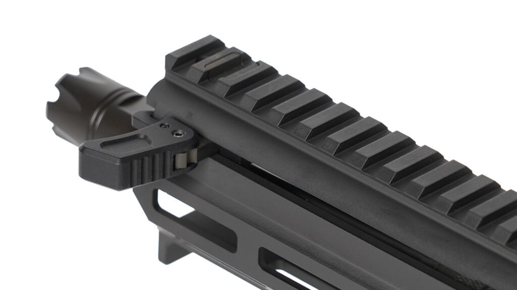 The pistol breaks from the typical AR charging handle with a left side, non-reciprocating side charging handle out on its compact forend. This offers the user better leverage to manually function the action as well as the ability to stay focused downrange while manipulating. For left-handed shooters, a right-side configured side charger is available.