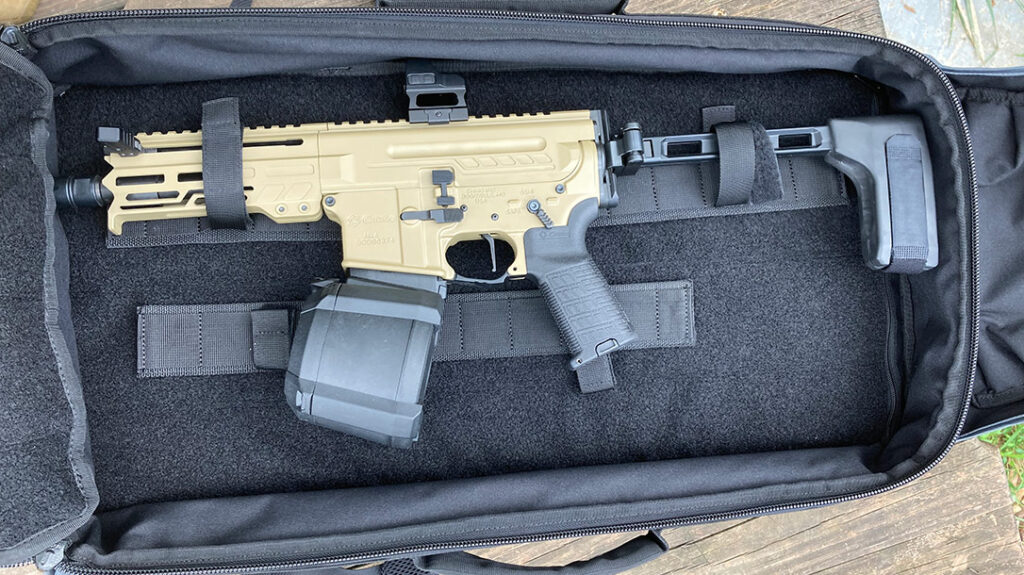 The Dissent is an ideal candidate with its firepower while still allowing for a modicum of discrete off-body carry. This is combined with accuracy and terminal ballistics far superior to any “normal” handgun. All the while offering the benefit of being classified as a handgun for CCW permit holders.