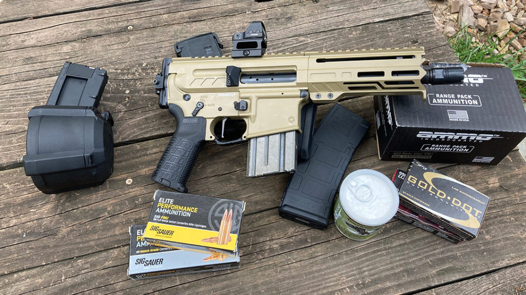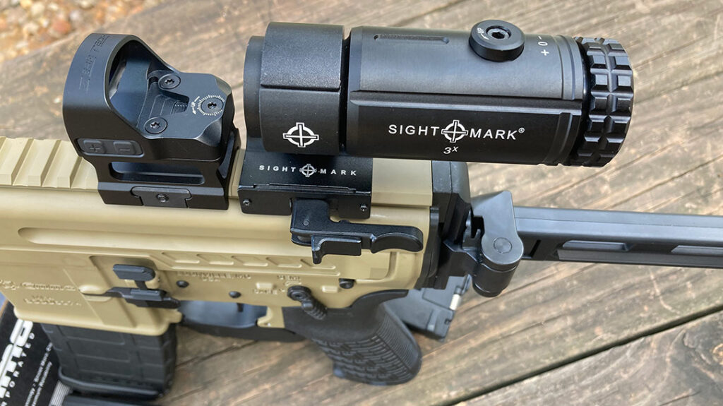 A ZeroTech Thrive HD reflex sight was mounted to the CMMG Dissent. Additionally, a Sightmark 3x magnifier was also used, especially during initial sight-in, just to see how far the Dissent could be pushed downrange.