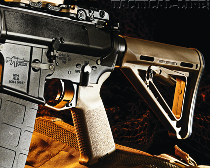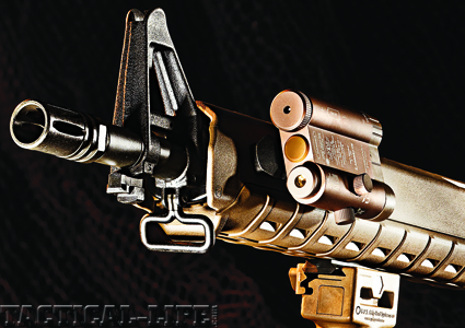 The most recent addition to their line is the M10. What sets the M10 apart is its mid-length gas system and rifle-length handguard with a 16-inch carbine barrel that is cold-hammer-forged and chambered in 5.56mm NATO with a 1-in-7-inch twist rate. The M10 is equipped with a full, rifle-length Magpul MOE handguard that extends out to the A2-style fixed sight. The MOE handguard has slots at two, six, and 10 o’clock positions for mounting accessory rails. The front sight’s forward location gives the user an extended grip to better “drive” the rifle and lengthens the sight radius. The side extensions and lip on the front of the MOE handguard protect the user’s hand from a hot front sight assembly.