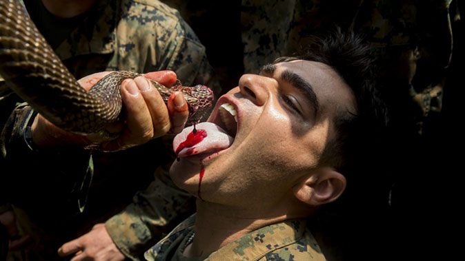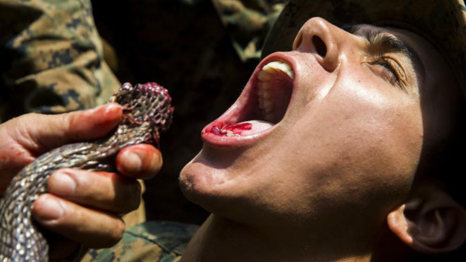U.S. Marines Lance Cpl. Nicholas Adams drinks cobra blood at jungle survival training during Exercise Cobra Gold 2018, at Camp Ban Chen Khrem in the Kingdom of Thailand, Feb. 17, 2018. Adams, a Sylvania, Ohio native, is a rifleman with Kilo Company, 3rd Battalion, 3rd Marine Regiment, 3rd Marine Division. Cobra Gold 18 is an annual exercise conducted in the Kingdom of Thailand from Feb. 13-23 with seven full participating nations. The Hawaii-based battalion is forward-deployed to Okinawa, Japan part of the unit deployment program.