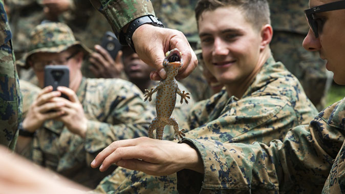 A jungle gecko is shown to U.S. Marines with 3rd Battalion, 3rd Marine Regiment, 3rd Marine Division while attending jungle survival training during Exercise Cobra Gold 2018, at Camp Ban Chen Khrem in the Kingdom of Thailand, Feb. 17, 2018. Cobra Gold 18 is an annual exercise conducted in the Kingdom of Thailand from Feb. 13-23 with seven full participating nations. The Hawaii-based battalion is forward-deployed to Okinawa, Japan part of the unit deployment program.