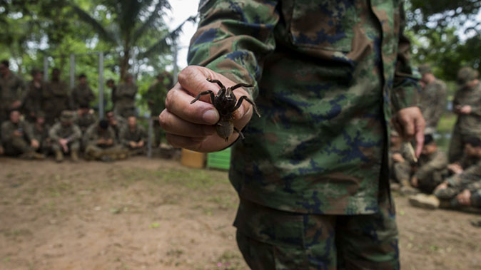 A tarantula is shown to U.S. Marines with 3rd Battalion, 3rd Marine Regiment, 3rd Marine Division while attending jungle survival training during Exercise Cobra Gold 2018, at Camp Ban Chen Khrem in the Kingdom of Thailand, Feb. 17, 2018. Cobra Gold 18 is an annual exercise conducted in the Kingdom of Thailand from Feb. 13-23 with seven full participating nations. The Hawaii-based battalion is forward-deployed to Okinawa, Japan part of the unit deployment program.