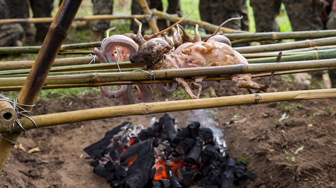 Jungle meat is prepared by the Royal Thai Marines for U.S. Marines with 3rd Battalion, 3rd Marine Regiment, 3rd Marine Division prior to jungle surivival training during Exercise Cobra Gold 2018, at camp Ban Chen Khream in the Kingdom of Thailand, Feb. 17, 2018. Cobra Gold 18 is an annual exercise conducted in the Kingdom of Thailand from Feb. 13-23 with seven full participating nations. The Hawaii-based battalion is forward-deployed to Okinawa, Japan part of the unit deployment program.