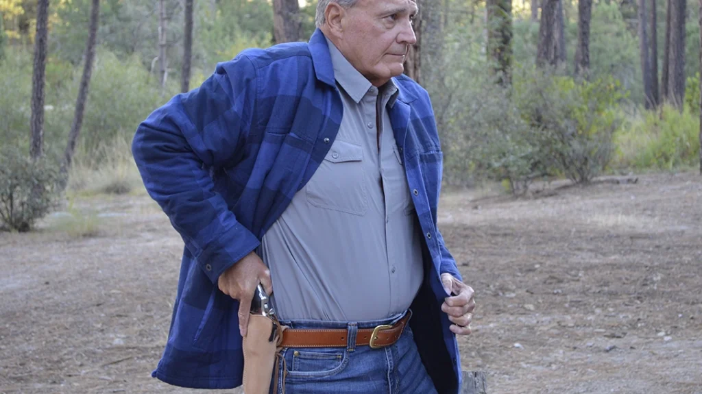 It has a fold-down collar, side seam vents, and snap cuffs. The Seth Shirt Jacket is not form-fitting. So, any gun on the belt will likely be unnoticed.