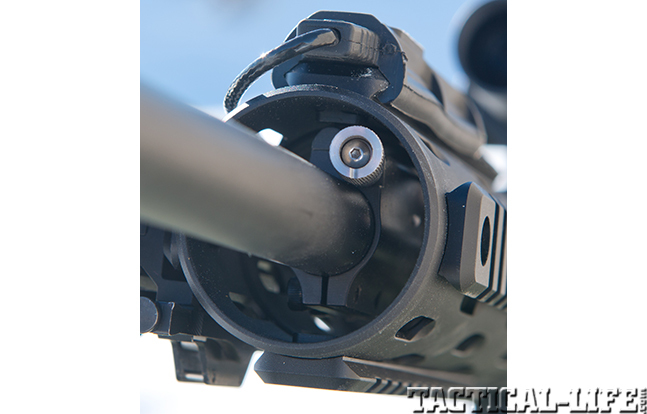The tendency is to “over-gas” AR-style rifles so they work with most ammunition. Over-gassing amounts to making the gas port hole large, sending more gas to the bolt. Short of custom-tuned rifles, most AR style rifles are over-gassed liked this, whether they’re direct impingement or piston driven. It’s just a product of the market, since ammunition varies and there is no way for a builder to make its rifles work perfectly with everything. Adjustable gas blocks allow you to tune the rifle to your ammunition, however. Many direct-impingement adjustable gas blocks require the use of a tiny little wrench, and they often come loose. The adjustable gas block on this rifle is a really nice design. A large knurled knob protrudes from the forend. You pull it out, adjust it and push it back in. It allowed me to adjust this rifle so that it was very smooth with the Hornady ammunition, and it never came loose—it’s a very nicely designed setup.