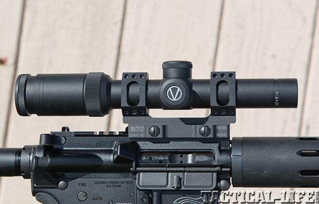 I added a Vixen Optics 1-6x24mm scope in an American Defense QD single-piece mount, which made it easy to attach and remove the scope with no loss in zero. The scope’s illuminated duplex reticle, positioned in the second focal plane, allows for better aiming at longer ranges.