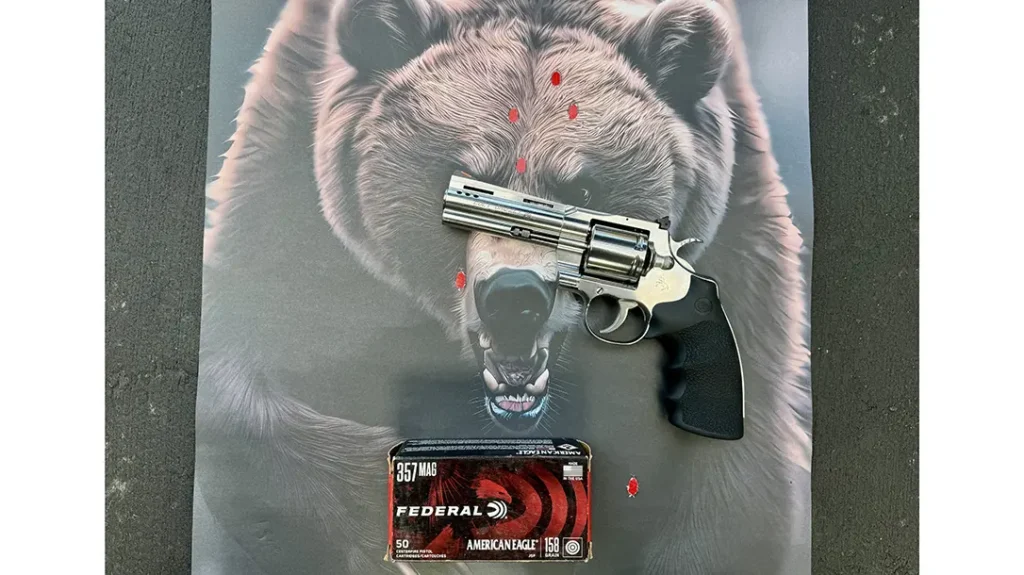 I avoided the bear “mauling” me during this test phase, placing between one and four shots into the optical triangle/brain pan of the ursine target. My best performance was with the Federal 158-grain JSPs. Needless to say, they were more controllable in rapid fire, and quicker to get back on target. The big 180-200-grain slugs were more of a challenge, but still gave some good hits.