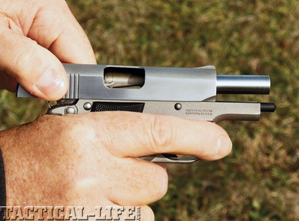 The Pocketlite has a very solid feel. The Mustang’s beavertail is a definite advantage on a short-recoil-operated system, where the slide travels well back over the web of the shooting hand.