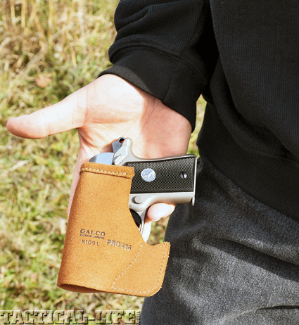 Galco’s Pocket Protector PRO438 grips the Mustang like a magnet and has a wide, double-stitched opening for easy reholstering.