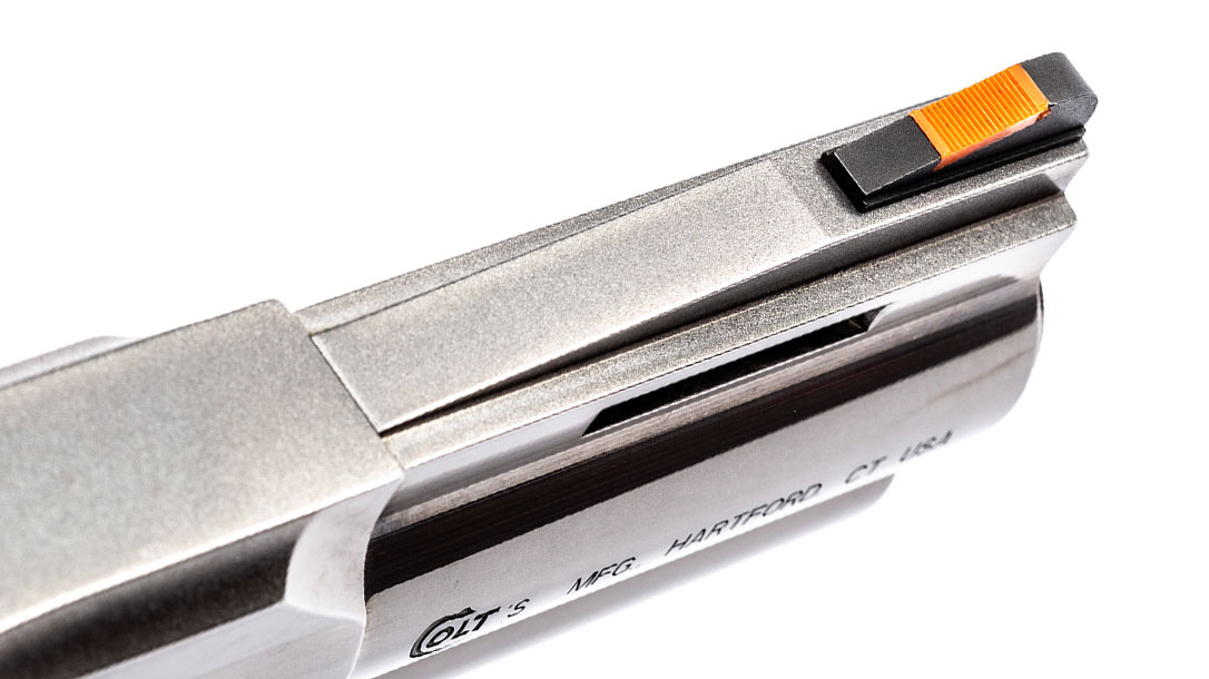 Colt outfits the Python with a red insert front sight that, in ideal light conditions, is very easy to pick up and makes a nice sight picture. But, in less-than-ideal lighting, the ramped angle of the sight reflects light, and it becomes very difficult to see.
