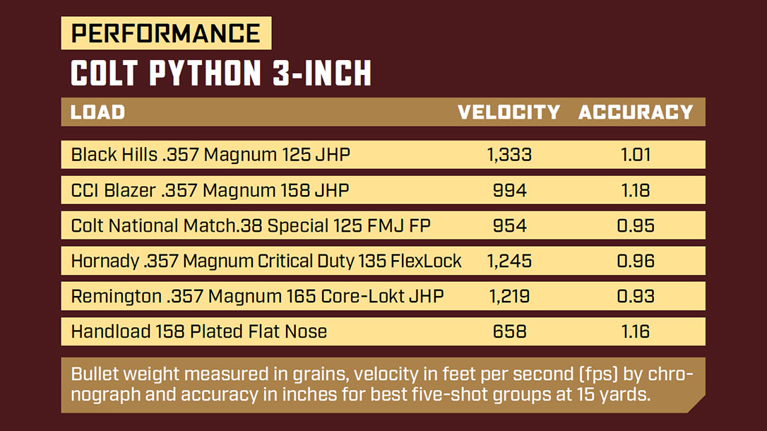 Based on the results of the ammunition I tested, I would probably load my Python with Hornady’s 135-grain Critical Duty FlexLock ammo. It, too, produced a sub-one-inch group at 15 yards and churned up 464 fpe.