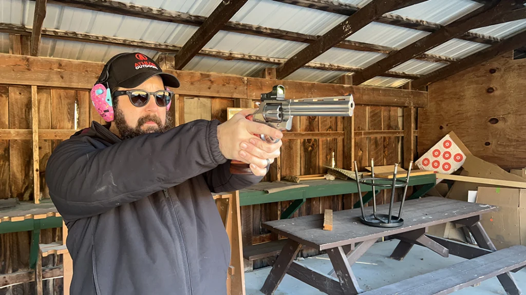 The modern Python has a distinct personality. It feels new, tighter, and more like a contemporary machine than a handcrafted instrument. The trigger is lighter overall but has more perceptible stacking at the top of the trigger stroke. That is a direct consequence of internal safeties and revised geometry rather than poor execution. At 82 yards I landed four out of six hits in double action. The misses were close. The gun is absolutely capable; I needed to do my job better. I would call them even.