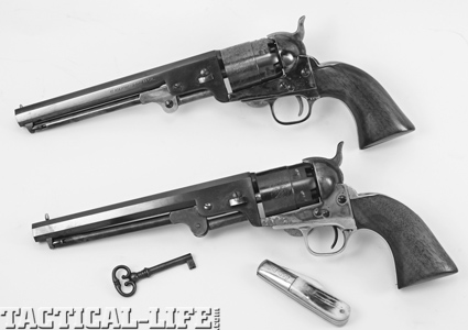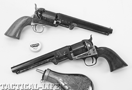 In the 19th century, no Navy revolvers were chambered for .44 caliber, but the author really likes reproduction Navies in that chambering. The bottom .44 Navy was made by the now-defunct firm of Armi San Marcos in the mid-1990s ordered from EMF. The top revolver was made by Pietta, but fitted with an Armi San Marcos grip assembly so both guns would feel and handle the same.