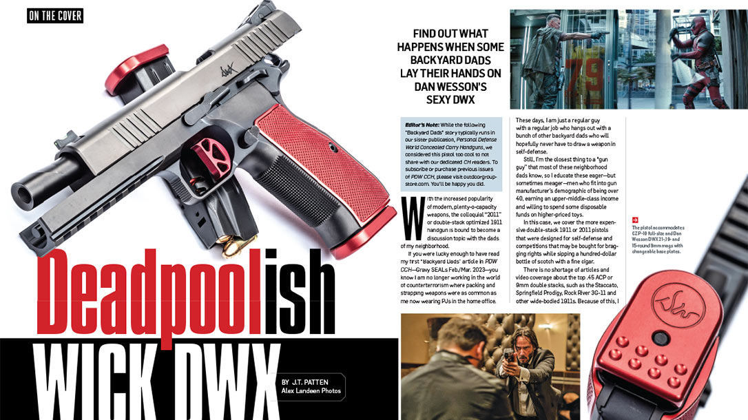 Our cover guns prove that point right off the bat. Take the Dan Wesson DWX, for example. Sure, it’s a sexy pistol but it’s also a very accurate shooter as you’ll see from our report beginning on page 28. Just for kicks, we put it in the hands of some “Backyard Dads,” and that’s when the fun really began.