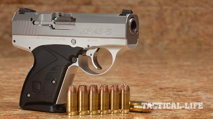 Boberg XR-45S: A larger-caliber development of the innovative XR9-S, the XR45-S brings lower recoil, a longer barrel and a higher magazine capacity than any many other .45 ACP subcompacts. The fully supported barrel is fed by a mechanism that loads the chamber from the rear of the magazine. In essence, this configuration allows for a longer barrel length within a short slide. For more information, visit bobergarms.com or call 651-287-0617.