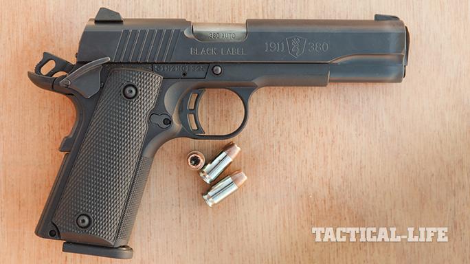 Browning Black Label .380: Browning’s new .380 ACP Black Label is a polymer-framed 1911-style pistol that features the original controls and shape, but at 85 percent of the .45-caliber 1911’s size. The magazine holds a useful eight rounds. At 17 ounces, it feels even lighter because the weight is low for a relatively large pistol with 4.25-inch barrel. The sights are plain black but very functional in daylight. This pistol is less a hideout gun and more of a lightweight update of the popular Colt Hammerless .380, producing as little felt recoil and greater accuracy with 30 percent less weight. It would be ideal for training teenagers or for carry by people with small hands. For more information, visit browning.com.