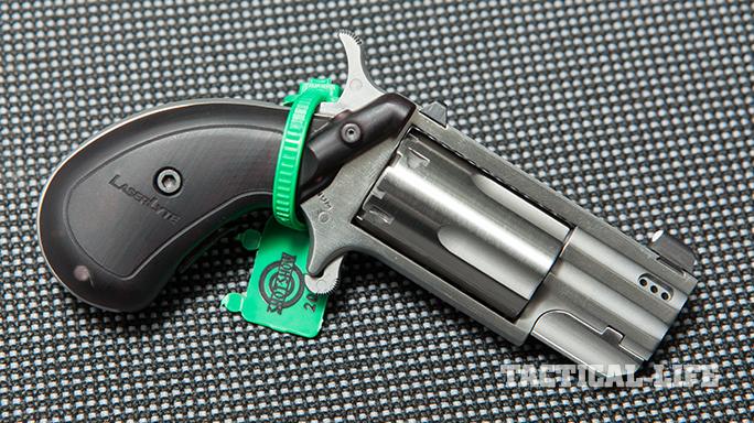 NAA Ported Pug With Laser: Created in cooperation with LaserLyte, this ported .22 WMR mini-revolver from North American Arms (NAA) is designed for fast aiming and quick follow-up shots. Porting reduces muzzle flip, while a pressure switch instantly activates the miniature red laser powered by a button battery. NAA previously incorporated lasers into larger mini-revolver models by replacing the cylinder pin assemblies with a part integrating a red laser within. For more information, visit northamericanarms.com or call 800-821-5783.