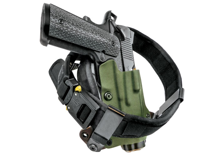 Kydex is a thermoplastic that is vacuum-formed around a mold to form a rigid skin that will not stretch or shrink. Holsters made of Kydex have a slick quality that translates into the pistol unholstering fast. The Bravo Concealment Adaptive (BCA) holster is made of .08-inch-thick Kydex. It’s tough stuff, as I purposely stood on the BCA with no ill effects. This is an outside-the-waistband (OWB) option that sits snuggly against that body and is very comfortable. Bravo Concealment will build the BCA to your specifications, so I ordered 1.5-inch belt loops, a 10-degree cant and a medium sweat guard. I carry a Glock 20 Gen4 in mine. That’s approximately 39.5 ounces of loaded, full-size pistol.