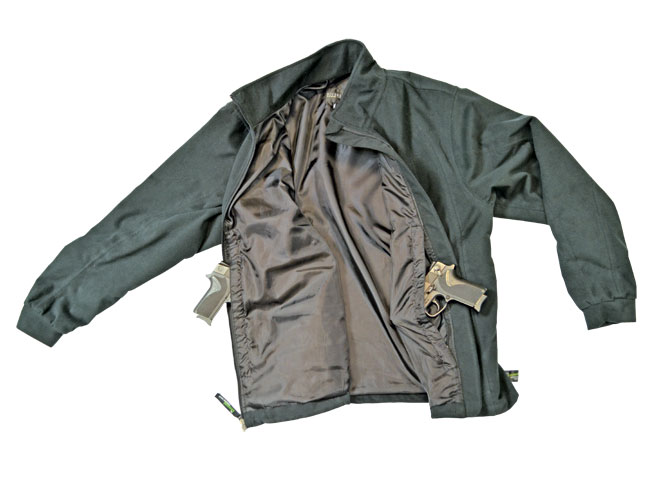 A system that combines a holster and a concealment garment is the Rivers West Full Metal Jacket. This lightweight fleece has a built-in shoulder harness that connects to a holster. The holster uses a concealed plate so it doesn’t print. There are two hand-warmer pockets, but a unique feature is that the holstered weapon is accessible via a hidden pocket. In fact, you can shoot through the garment with the weapon completely hidden. I’ve worn the Full Metal Jacket this past fall and winter carrying a Glock 17 and no one was the wiser. I’ve been told the slide won’t hang up in the garment, and the way it is constructed I’m inclined to believe them. I like the jacket so much I don’t want to shoot through it.