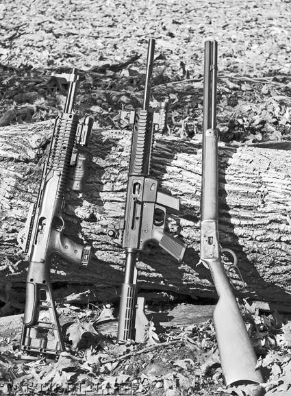 For most of the 20th century, guns like the 1892 Winchester (right) filled the role of high-capacity, pistol-caliber personal defense weapons, but now twenty-first-century carbines like the Hi-Point 4595 (right) and the JR Carbine (center) are more versatile platforms.