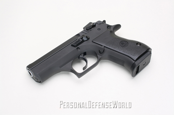 One Baby Eagle model that provides a balance of easy carry and comfortable shooting is the model BE9912RB. It’s a compact 9mm with a steel frame. Both the slide and the frame are treated with a durable matte-black-oxide finish. The slide is topped with low-profile, metallic, three-dot combat sights. The slide-to-frame fit is excellent, with full-contact internal slide rails providing for smooth cycling. The BE9912RB is hammer fired, with a double-action (DA) trigger pull weighing about 12 pounds and a single-action (SA) trigger pull dropping to 5 to 4.5 pounds. The ambidextrous thumb safety also acts as a decocker.
