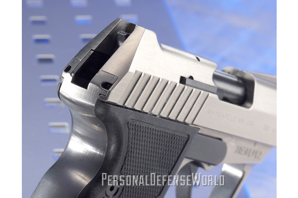 One feature that sets the Micro Desert Eagle apart is its action. Instead of having a straight-blowback-operated action, the pistol features an unusual, but reliable, gas-delayed blowback system. Two small ports are situated just in front of the chamber to direct expended cartridge gases both forward and upward to slow the slide as it recoils. The delay facilitates the use of a slide and recoil springs with less weight than a standard blowback design requires. Twin recoil springs ride on a pair of guide rods located on opposite sides of the barrel at the bottom of the slide. The trigger-to-action transfer bar for the double-action-only (DAO) ignition system is located on the right side of the pistol, where it’s partially covered by the right grip panel. The magazine release is located on the left side of the grip frame and is set into a depression in the grip to help prevent unintentional magazine releases.