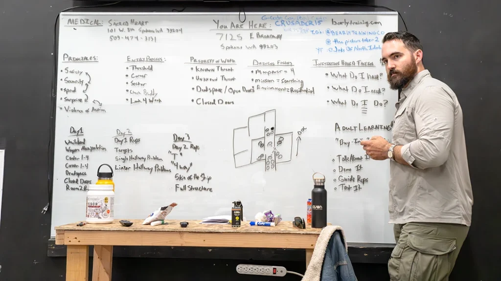 If you were in the shoot house, you had an instructor teaching and guiding you. If you needed more practice, you popped over to the classroom and got some guidance and continued to work on that topic. The class was a mix of newbies–some experienced, military veterans and average-Joes from different walks of life. Then there was a group of three guys who sat at my table. They stood out in a peculiar manner–almost out of place and not like the other students. The group of three moved pretty fluidly, like an experienced team. Turns out, they were! The gentleman and his companions were part of Bearly Training Company based in San Diego, California. They showed up to Spokane to professionally participate in Orion Training Group’s 3-day in a quest to refine their craft. They were fantastic and their presence was an asset the rest of the student body.
