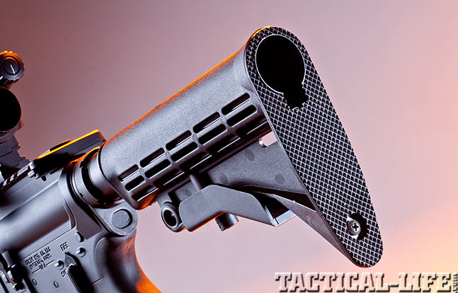 The buttstock looks very similar to the Colt military version but does not have the fixed sling loop at the toe. It appears that a plug can be removed if the owner wanted to install one, though. The buttstock does have the slot at the rear, just below the tube, for the attachment of a sling, but there is also a quick-detachable, ambidextrous sling swivel socket. However, if the owner wants to use a sling, an attachment point will need to be added to the handguard. That should be easy, because a Picatinny rail can be added at the 3, 6, or 9 o’clock positions.