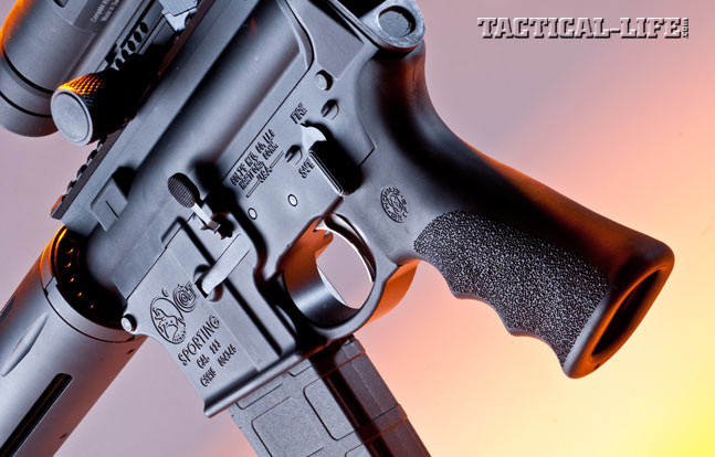 The pistol grip is a Hogue rubber grip with finger grooves that will fit some shooters’ hands perfectly and will be hated by others. It is non-slip, though, and has a high, rounded backstrap that creates a longer trigger reach compared to a standard A2-style grip. If you don’t like it, you can easily change it out.