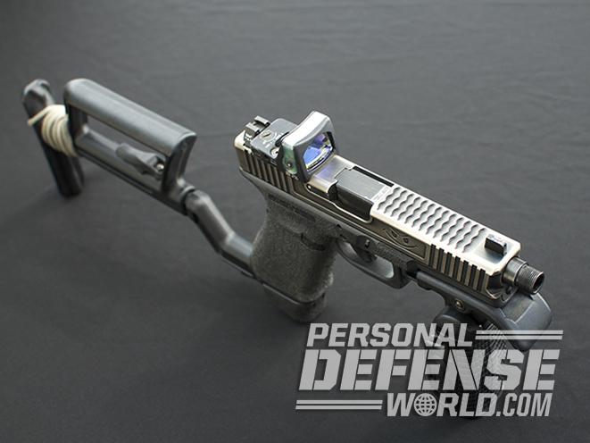 The first iteration of the GS17 used a Glock 17 slide with a set of fiber-optic sights. Pistol sights work great when held at arm’s length. However, once the pistol is brought close to the eyes, which is the case when shouldering the GS17, the sight picture changes dramatically and it’s very difficult to get a crisp sight picture. In the compressed CQB world, you really need an optic that you’re looking through, versus sights you have to look at. Fortunately, outfitting a pistol with an optic is much easier nowadays than it was even two or three years ago.