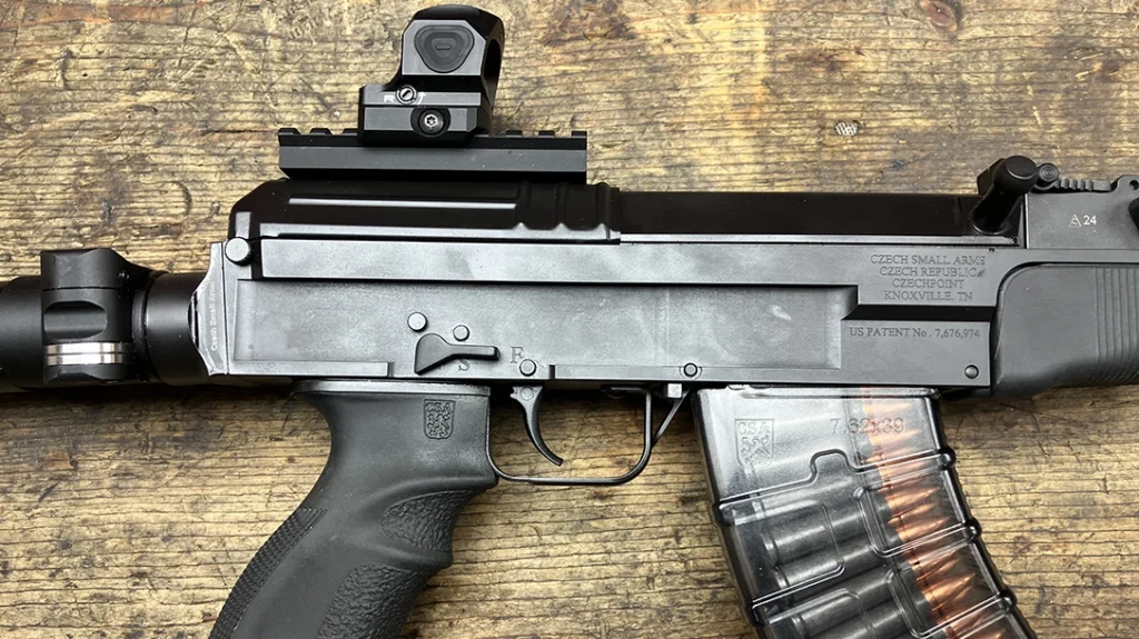 Unile the AK’s triangular-shaped selector, the vz5 uses a much more refined “paddle” safety/selector that’s located on the right side of the receiver. It’s much more ergonomic than the AK’s since the vz58’s unit doesn’t have to play the part of dust-cover either. Keep in mind that the safety operates opposite of an AR-15’s. Down/vertical is “safe” and horizontal is “fire.”