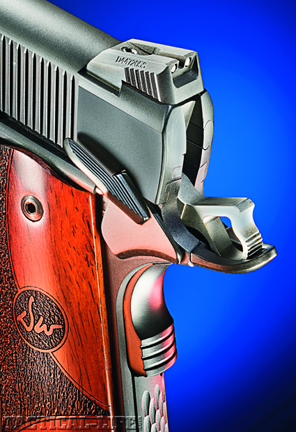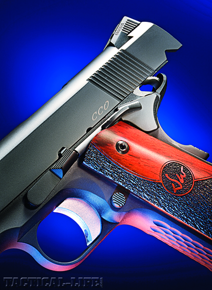 A couple of nice touches are the really nice grips and understated markings. No gaudy symbols, names, or sayings engraved in the slide, just a nice, understated CCO and that is it. The magazine release is also not extended, nor is the slide release. Being designed for concealed carry, anything sharp either hurts or snags, but there is nothing sharp on this pistol to do either. It fits comfortably in your hand and it just plain looks nice. As I passed it around the shop everyone commented on how well it felt and how nice the pistol looked. You would think you were holding a $3000 custom 1911 and not a $1500 production pistol.