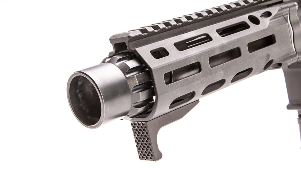 Of course, considering the pistol’s compact footprint, 300 Blackout chambering and muzzle threading, it’s just screaming for a suppressor. So, Daniel Defense has included one of its new Grip-N-Rip charging handles. Not only does this charging handle have latches on both sides for quick ambidextrous use, but it’s also engineered for suppressor use, redirecting gases upward and away from the shooter’s face. If you’ve ever run a suppressed weapon—especially a short one—you’ll appreciate what this does. Gone are the days or watering eyes and the feeling that you’re going to end up with black lungs after inhaling so much gas.