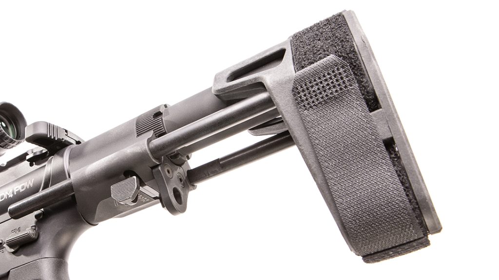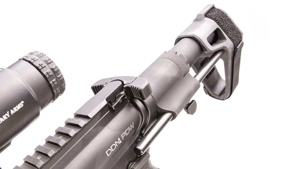 The lower receiver is CNC-machined from 7075-T6 aluminum like the upper. It sports a flared magazine well, an ambidextrous safety and Daniel Defense’s only Soft-Touch overmolded pistol grip. But perhaps the most important feature is the Maxim Defense CQB arm brace, which rides on two rails and offers four different length-of-pull positions. Fully collapsed, the DDM4 PDW comes in at just 20.75 inches long overall, so it’s easy to fit into a backpack for discreet stowage and transport. With the brace fully extended, the overall length is just 34.75 inches, and the buffer system is also enhanced for optimum reliability whether you’re shooting suppressed or unsuppressed.