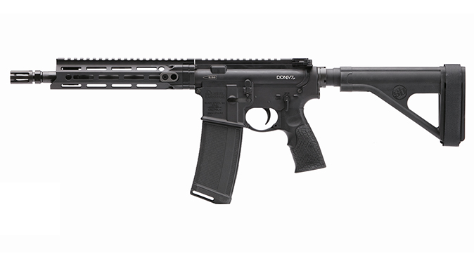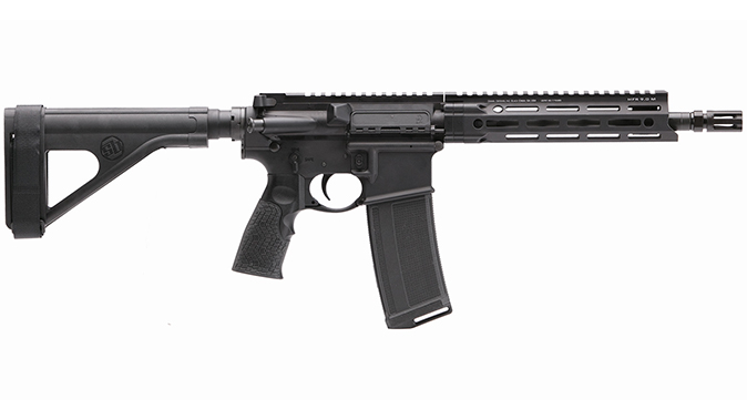 The DDM4V7P features a SB Tactical SOB pistol stabilizing brace and is classified by the ATF as a pistol, not a SBR, meaning there’s no tax stamp involved.