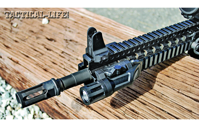The Daniel Defense SSP was 100 percent reliable with the SureFire Mini in place. The test included a 20-round magazine dump to ensure that the rifle was reliable even when the gases and the suppressor heated up. The Mini also reduced the sound signature to a level that, while not OSHA hearing safe, was significantly less than the normal report of a 5.56mm carbine. In addition, the SureFire Mini eliminates the overpressure and concussion that is typical with SBRs.