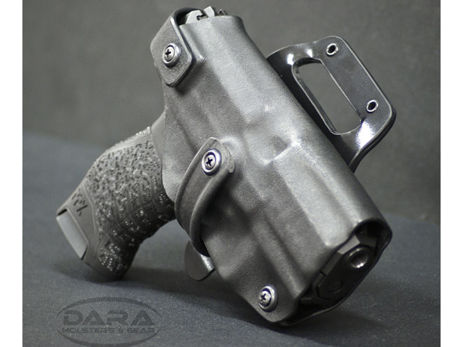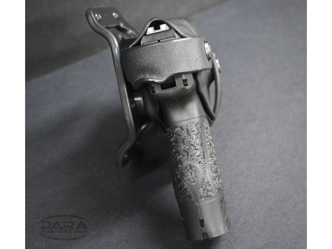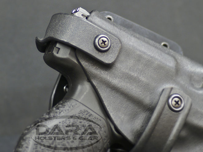 Made from .125″ Boltaron/Kydex riveted to .093″ Boltaron/Kydex for unbeatable strength and the support, the brand new Level III Duty Holster features three separate levels of retention: the first is Dara’s adjustable military grade retention system featured on all of the company’s custom holsters. The second is the thumb throw retention system, which consists of “a rotating hood held in the upward position by a molded detent, giving it a very similar feel to a tight operating safety on an AR-15 variant rifle,” the product listing reads. It’s a completely manual system.