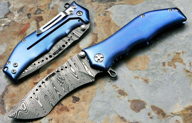 The 3.5 Inch Gun Hammer is the smaller version of the larger Gun Hammer. The knife stands out with its smooth blue anodized titanium 3D handles and a Radian stainless steel Damascus blade.