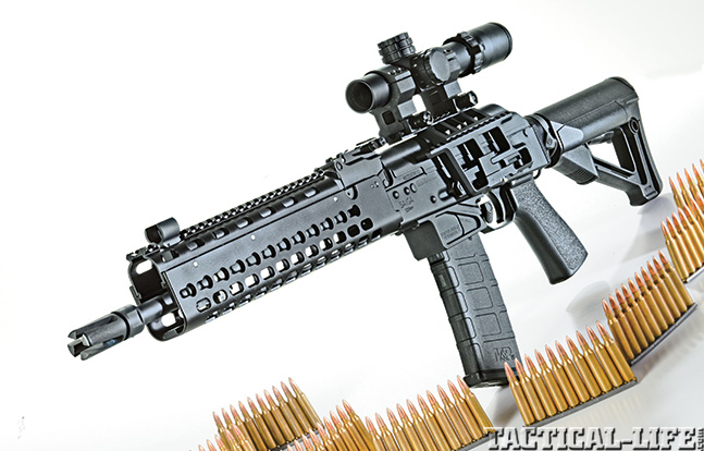 The standard stock has also been replaced with a six-position adjustable Magpul STR stock with battery storage space. This is attached using a mil-spec AR buffer tube and a Rifle Dynamics M4 stock adapter. Also included is the Magpul ASAP Ambidextrous Sling Attachment Point.