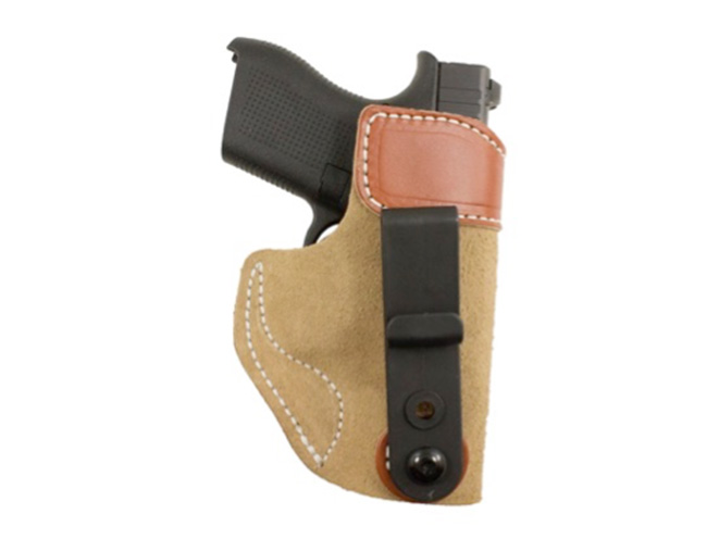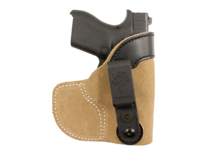 This is an IWB/Tuck-able holster with adjustable cant. It can be worn strong side, cross draw or on the small of the back. It is built from soft, no-slip suede and reinforced at the top with premium saddle leather to aid in re-holstering. MSRP is $31.99. For more, visit http://www.desantisholster.com/SOF-TUCK.