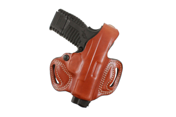 Thumb Break Mini Slide: This holster is crafted from premium saddle leather. Double seam stitching and a highly detailed mold make this exposed muzzle, two-slot holster a great choice for your favorite pistol. The Thumb Break features an adjustable-tension device for an even more customizable fit. It is available in black or tan leather. Belt slots are 1 3/4″ wide. Style #085 retails for $69.99.