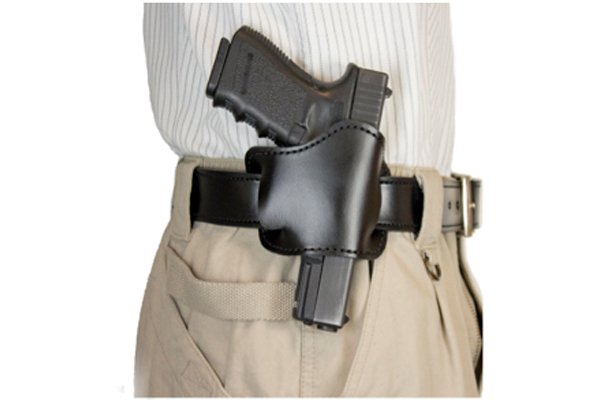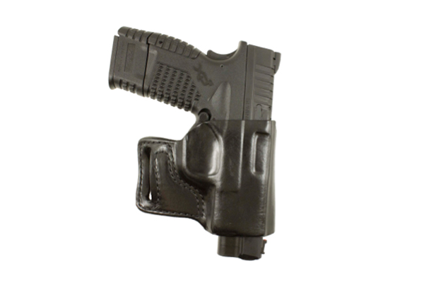 E-GAT Slide: This is a basic neutral cant concealment OWB holster that works equally well on the strong side or cross draw. It’s available in plain black economy finished top grain leather only. Retail price is $31.99.