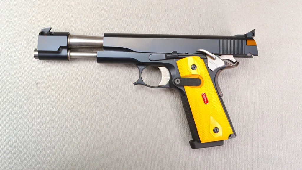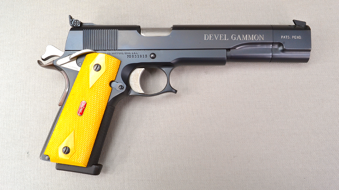 During the early 1980s, Devel was quickly moving into the custom competition Colt 1911 game with guns in both .45 ACP and .38 Super calibers. While the above improvements and others were offered on all custom Colt 1911s, one other improvement was available on only one gun.That device was the Devel Abator, a highly specialized combination muzzle brake and barrel weight attached to the barrel, giving the impression of a 6-inch-long slide. The super customized Colt it was made for was the Devel Gammon, which is the subject here.