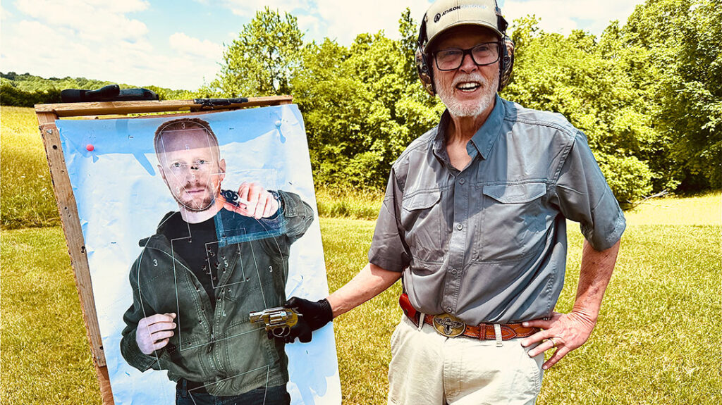 I moved to the target, standing an arm’s length away, with the revolver holstered. Then, I placed my support hand on the target, simulating pushing back an aggressor, and drew and fired two rounds one-handed. I held the SDR close to my side to prevent a gun grab.